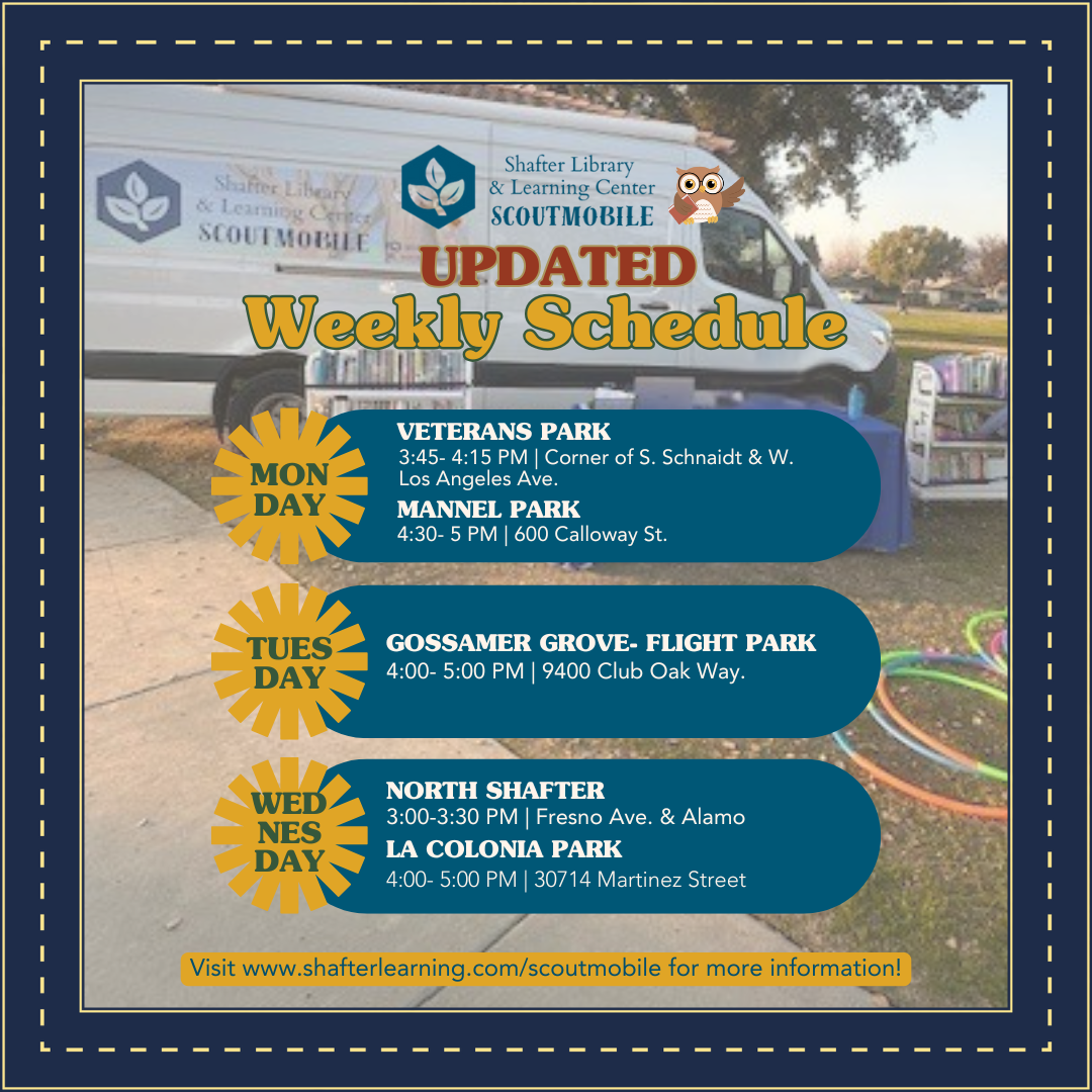 Scoutmobile makes numerous stops around Shafter. You can request books and pick them up at the location that is most convenient to you. Use our library catalog to request books we do not have or place holds on ones that we do, using your library card.